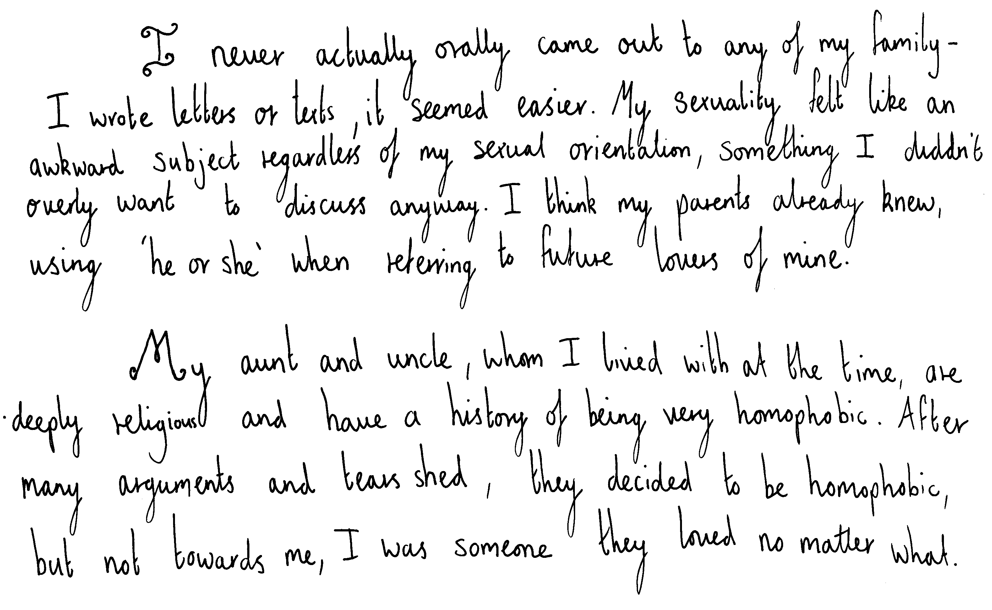 I never actually orally came out to any of my family – I wrote letters or texts, it seemed easier. My sexuality felt like an awkward subject regardless of my sexual orientation, something I didn’t overly want to discuss anyway. I think my parents already knew, using ‘he or she’ when referring to future lovers of mine.